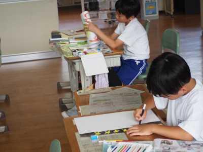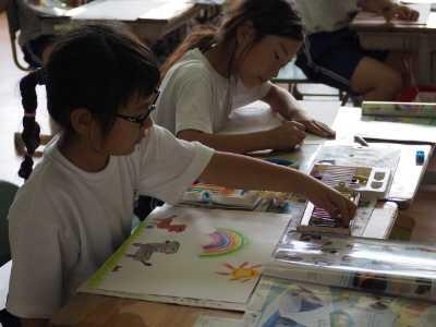 2024年6月17日 12時19分3年生は図工の「立ち上がった絵のせかい」の学習です。紙の表と裏に自分の好きな絵をかいて立たせます。立ち上げたときの見え方を確かめながら取り組んでいました。