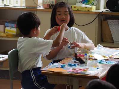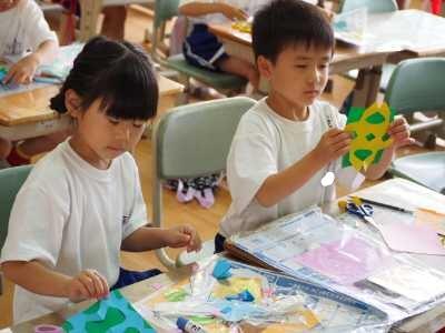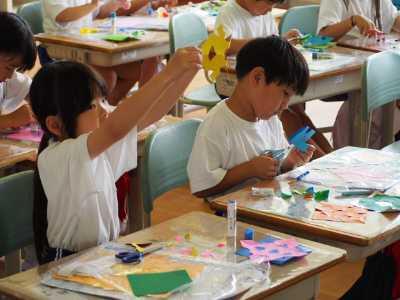 1年生の図工は、「ちょきちょ きかざり」です。色紙を折り、はさみで好きな形を切りぬいています。色紙を開くと・・・いろいろな模様ができています。できたかざりをお互いに見せ合っていました。みんな夢中になって取り組んでいました。