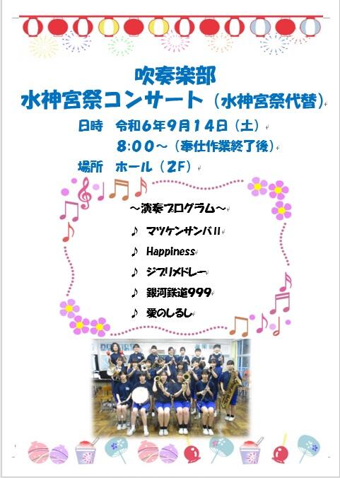 吹奏楽部は、地域で開催されている「水神宮祭」というお祭りの時に、毎年演奏を披露しています。