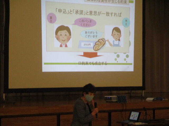 スマホに関する消費者被害やトラブルなどの危機を回避するために、必要とされる知識や考え方について、インターネット上の契約における危険など具体的な事例をもとにお話ししていただきました。クイズなども交えながら、楽しく、わかりやすい講義でしたが、身近に潜む危険について、十分認識することができました。