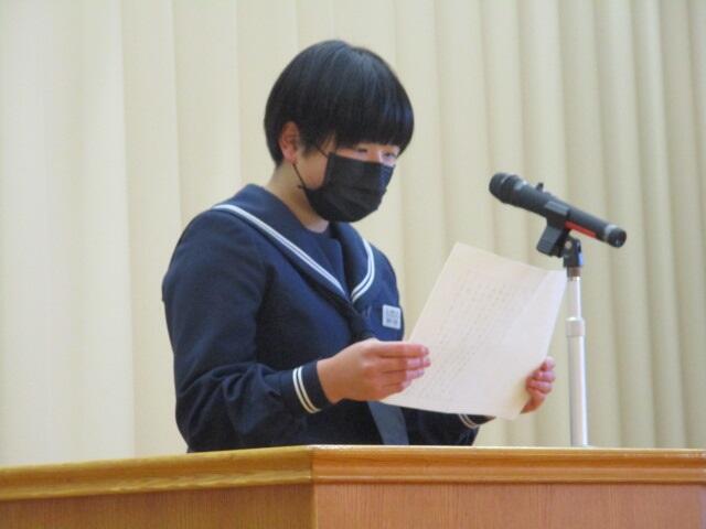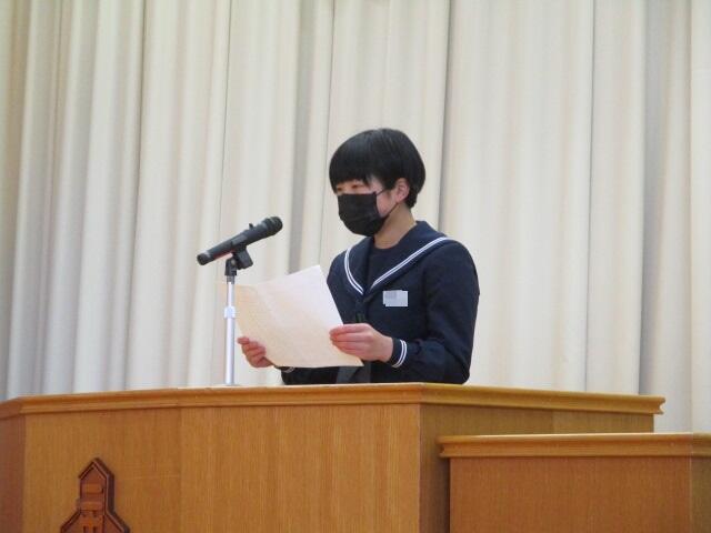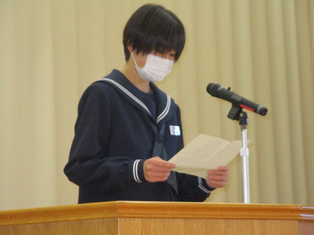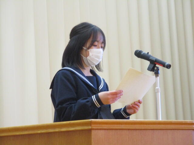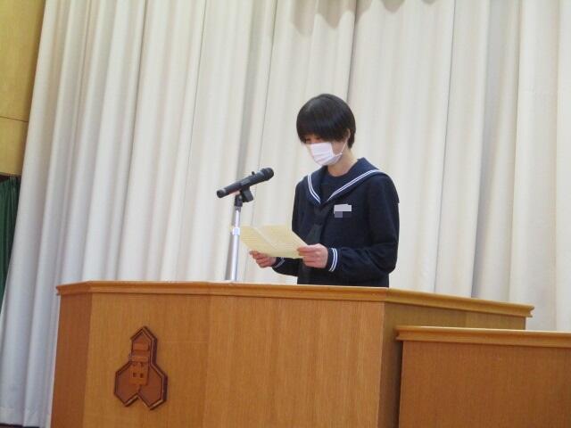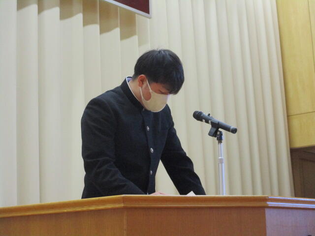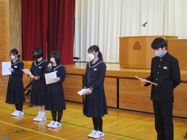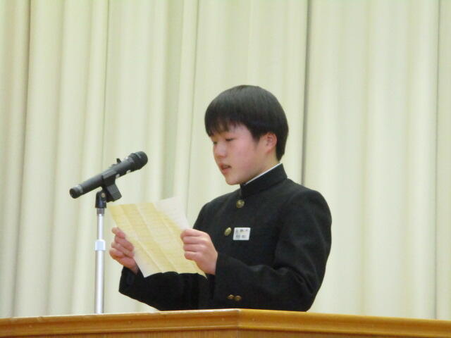 終業式後は、生徒会役員による冬休みの過ごし方、生徒指導担当からの諸注意、そして学年代表による2学期の反省や3学期の抱負について次のような発表がありました。