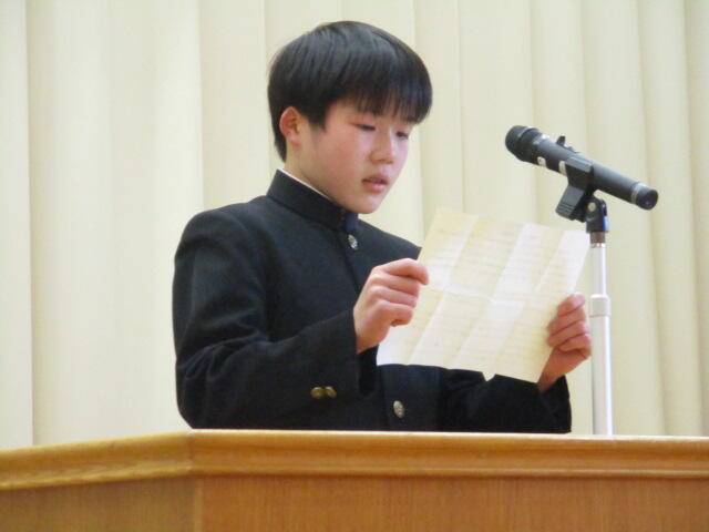 「僕は、この3学期に頑張りたいことがあります。それは、日々の生活や勉強などの面を強化して2学期よりも成長し、そしてこれからも気を抜かずに生活していくということと、みんなのためになるようなことを率先してやりみんなの役に立つということです。