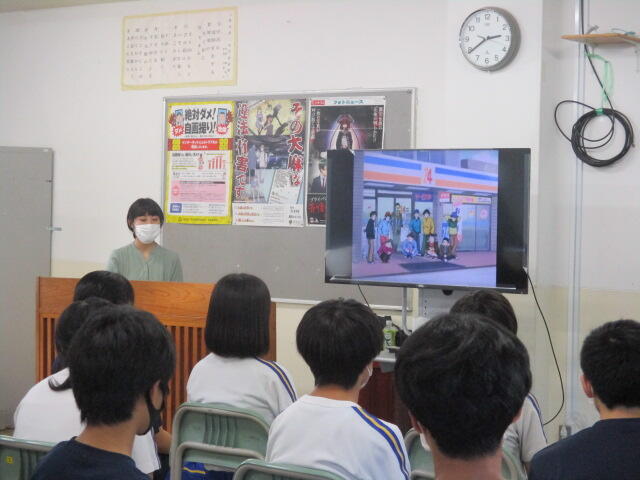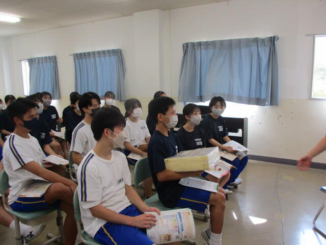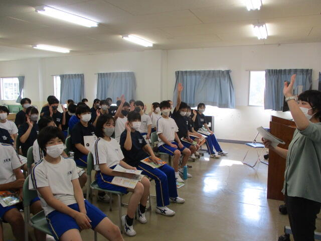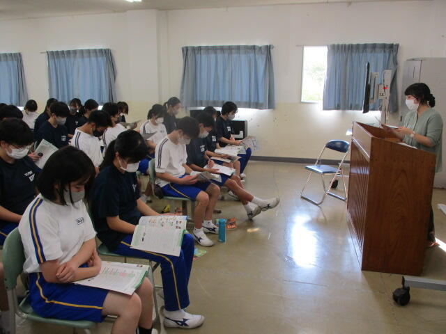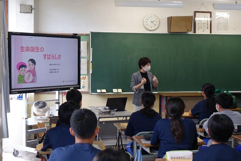 9月28日(木)6校時、1年生は思春期講座がありました。医療センターの助産師の方を講師としてお招きし、前半は生命誕生についての講話をいただきました。後半は、実際に赤ちゃん人形を抱っこしたり妊婦体験ジャケットを着用したりすることで、妊婦さんの大変さや命の大切さ、相手を思いやる大切さを学ぶことができました。丁寧で分かりやすい説明と貴重な体験活動をさせていただきありがとうございました。