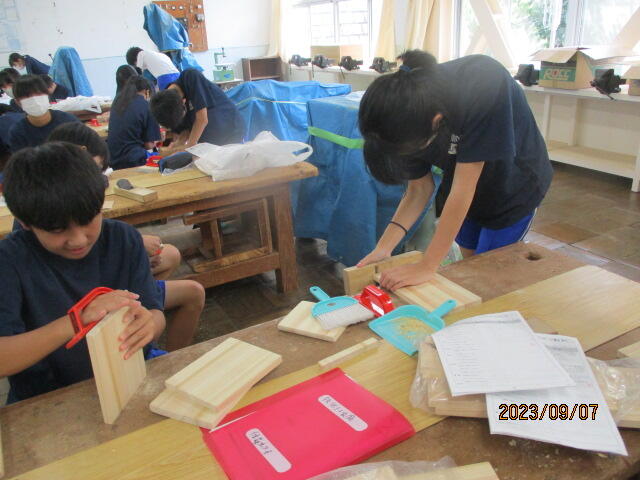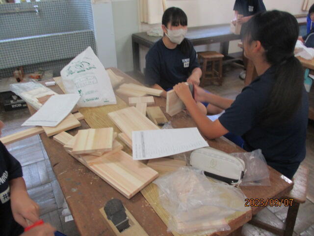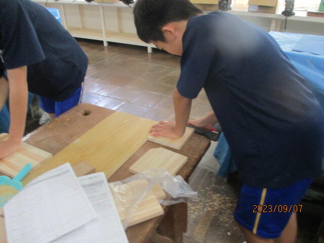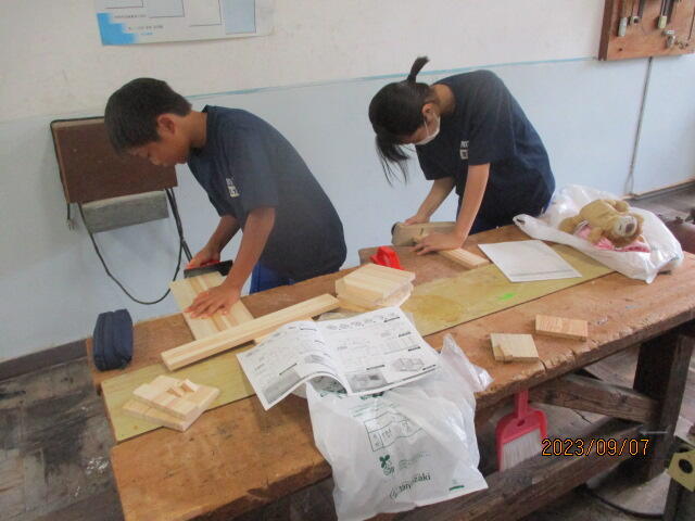 1年生の技術の授業では、森林環境学習推進事業からの補助を受けて木材加工の学習を進めています。生徒自身が選択したデザインを元に、板材をけがき、切断、切削等を行っています。