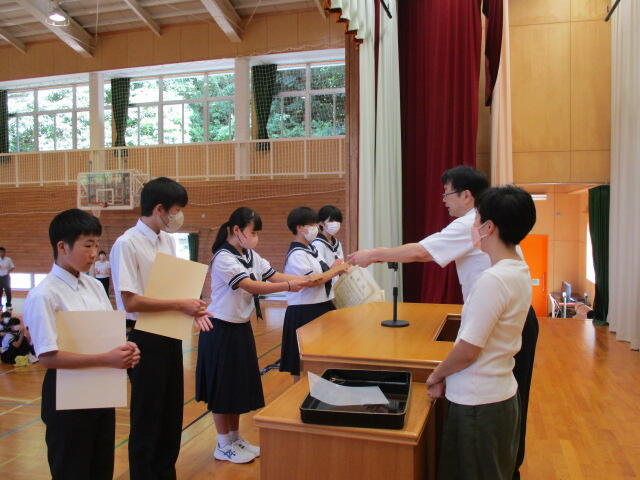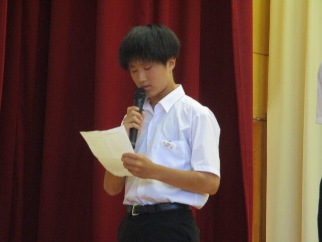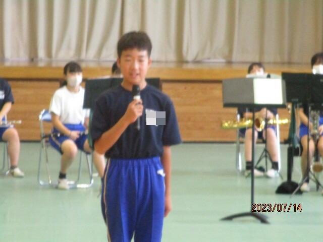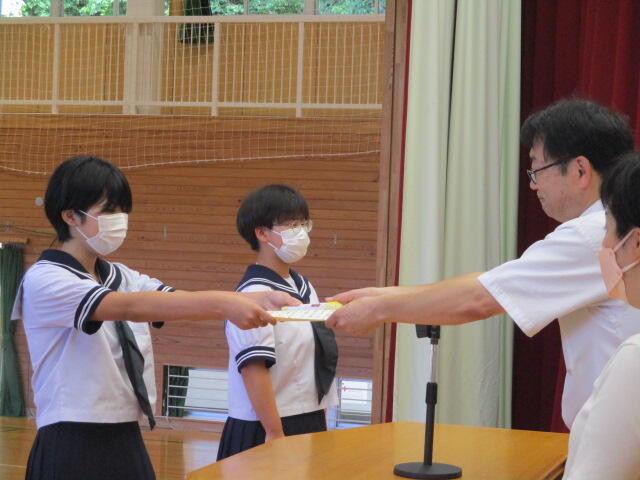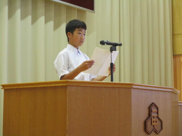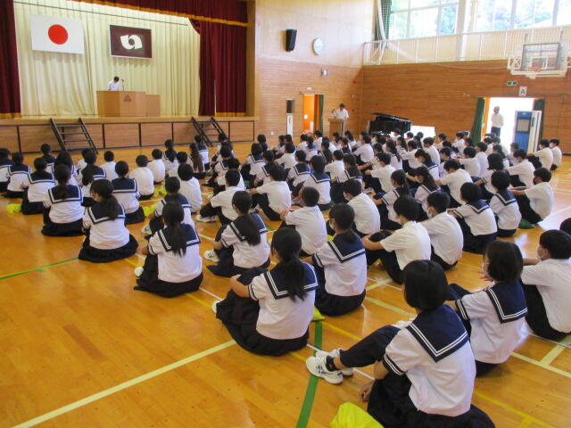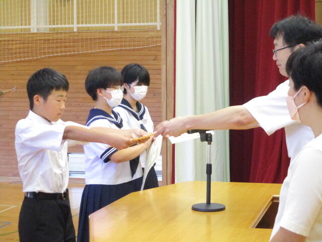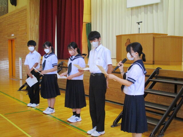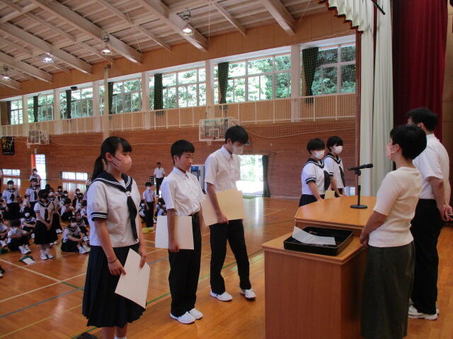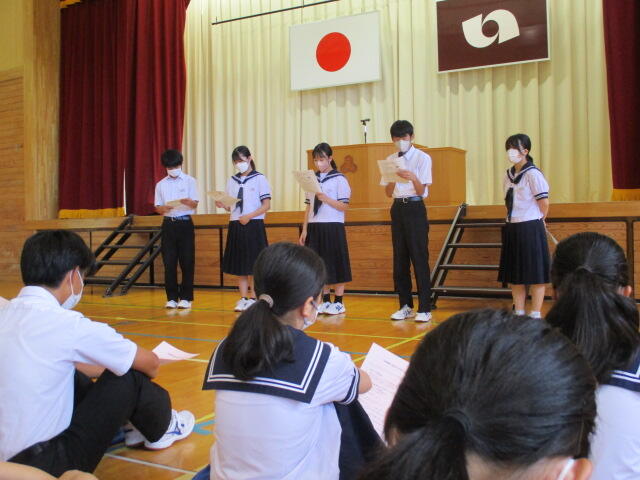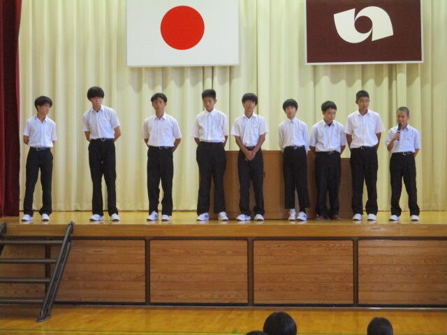式終了後は、夏季休業中の受賞者の表彰や学年代表による2学期の目標の発表、そして市駅伝大会の激励会を行いました。