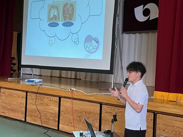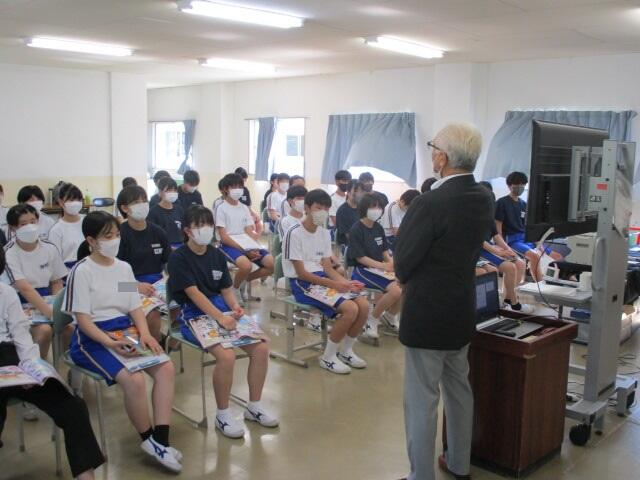 本日、6校時は、体育館で全校生徒を対象に薬物乱用防止教室を行いました。講師は本校の学校薬剤師で管理薬剤師としても活躍している紺野賢司先生です。