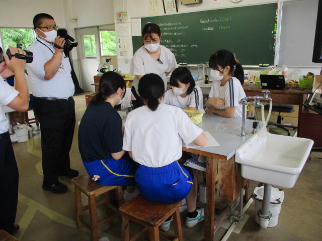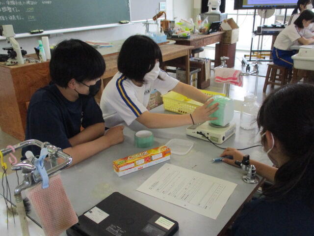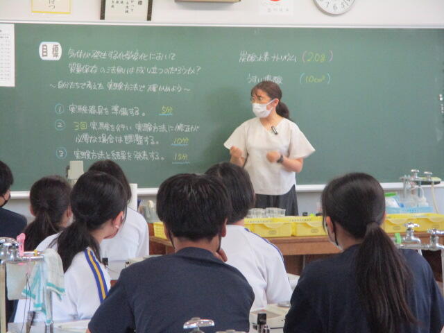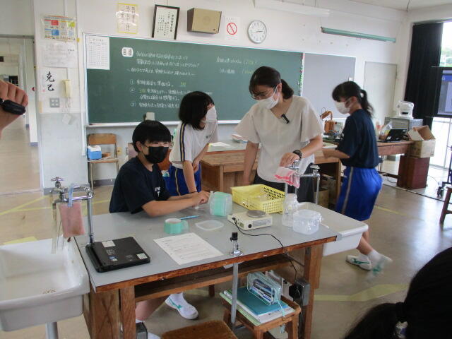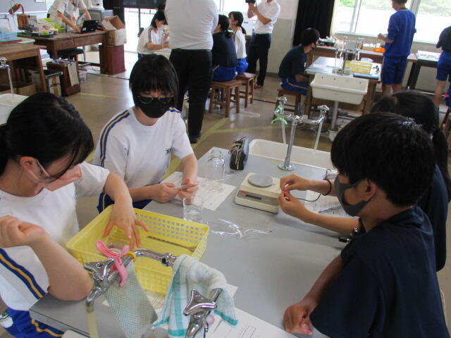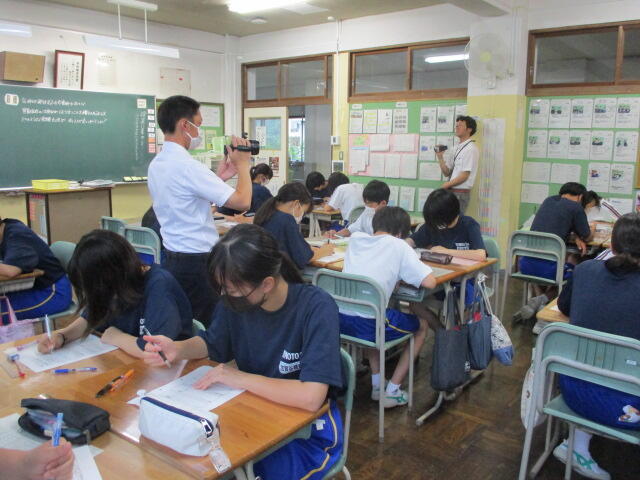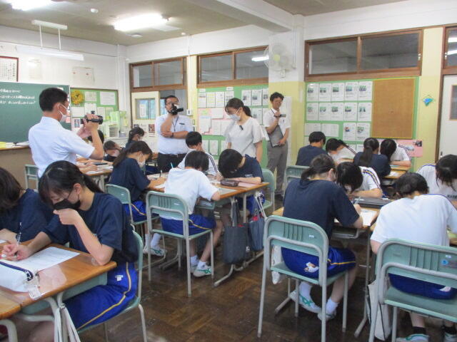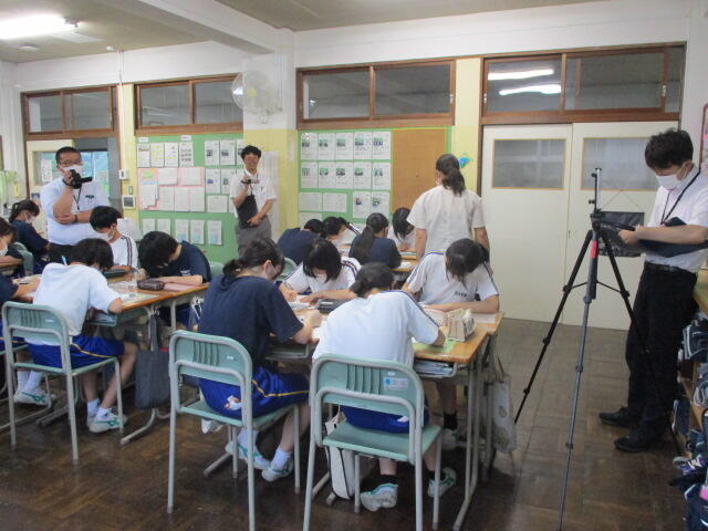 本日、5・6校時に2学年理科の授業動画の撮影を行いました。この動画は、いわき市総合教育センターの指導のもと作成し、今後市内小・中学校教員の授業力向上のための研修資料として活用される予定です。いつもと違う雰囲気の中、やや緊張した面持ちで臨んだ生徒たちですが、授業が始まるといつも通り目を輝かせながら実験等に取り組んでいました。