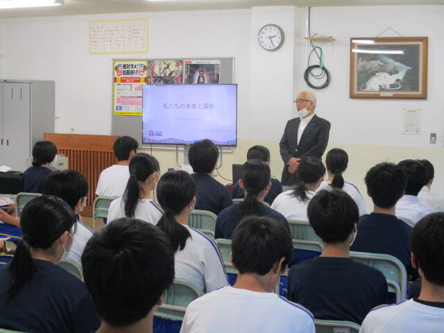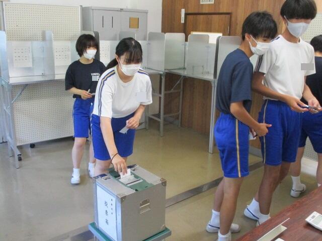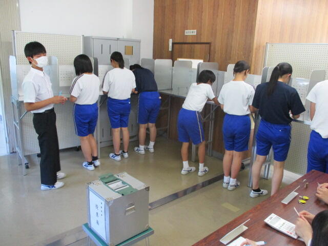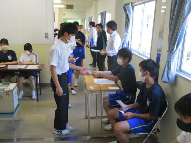 3学年は、選挙管理委員会の皆様により有権者教育を行っていただきました。実際の選挙に使う投票用紙と記載台を使って投票の体験をしました。3年後、18歳になり選挙権を行使する時に備え、有権者としての意識を高めることができました。
