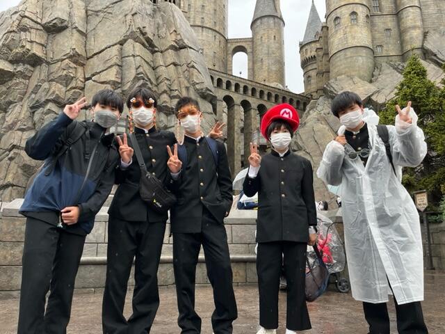 雨も何とか持ちこたえ集合写真をとることができました。撮影後解散すると、生徒はアトラクションへと駆け出していきました。ハリーポッターへGO~