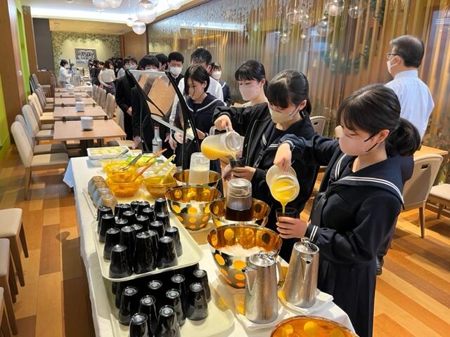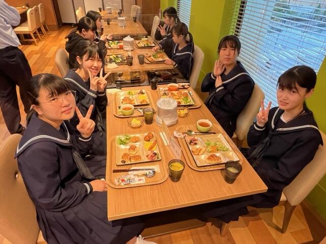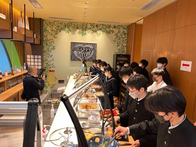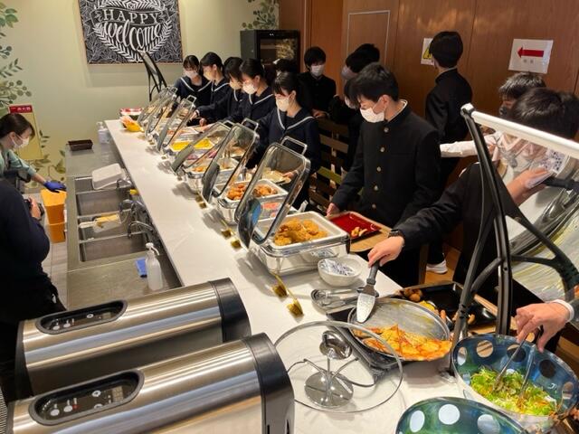 ちょっと眠そうな人もいますが、体調不良者もなく、みんな元気です。朝食はバイキングです。中学生が好きそうなメニューが並んでいます。