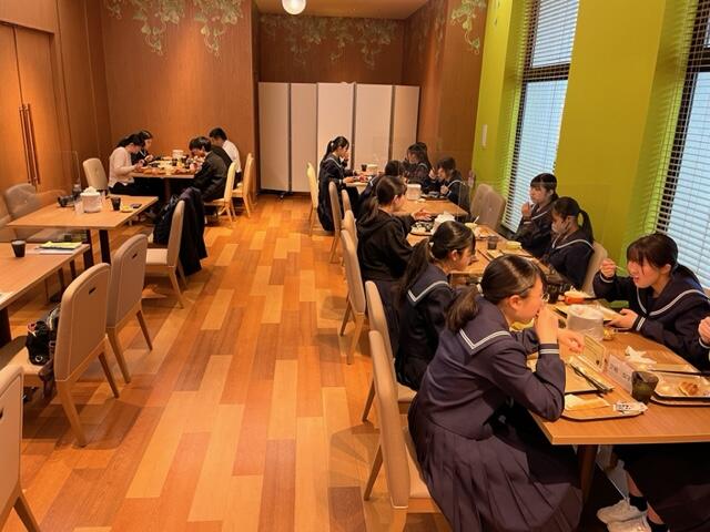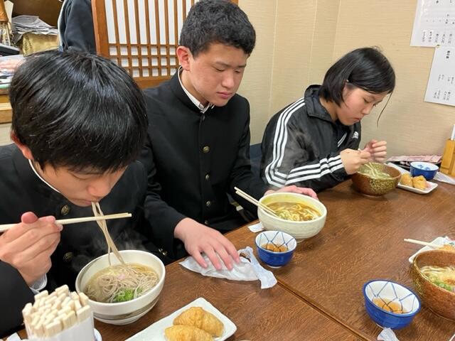 京都班別研修では、それぞれの班ごとにお昼ご飯を食べる予定です。伏見稲荷では、うどんやそばを食べました。雨で冷えた体が温まります。