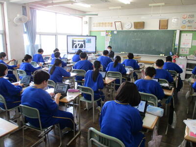 本日より、時間割授業開始となりました。GIGAスクール構想に基づき、本市においてもICT活用のための環境整備が進み、昨年度より生徒一人ひとりにタブレットが割り当てられ、授業その他に活用されるようになりました。