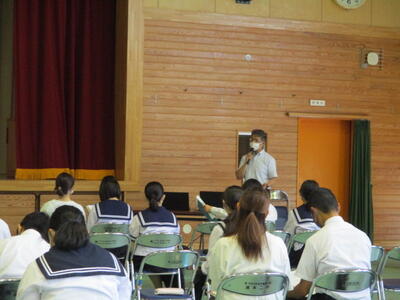 まとめとして、生徒指導主事から、新型コロナウイルス感染症対策の徹底を含めて、事故なく安全で楽しい夏休みにするための注意点を指導しました。