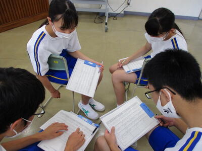 「小学校との違いにとまどいましたが、みんなで努力し、先生や先輩から教わって慣れてきました。部活動は大変でしたが、楽しいことや学ぶことがありました。初めての期末テストも頑張りました。」「夏休み。学習面では、苦手なところと得意なところを整理し、できないところをできるようにしていきたいです。生活面では、家の手伝いなど『中学生10の実践』を意識して生活したいです。」