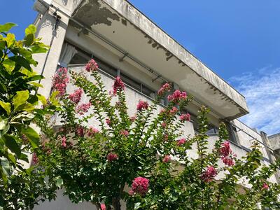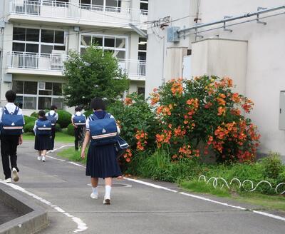 梅雨が明け、学校のノウゼンカズラが生徒の登校を迎えています。