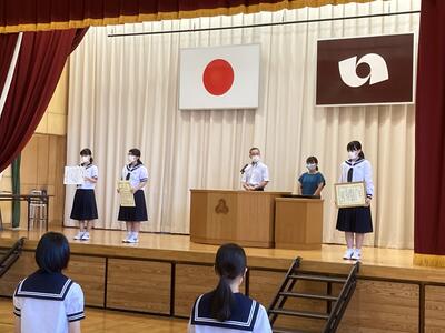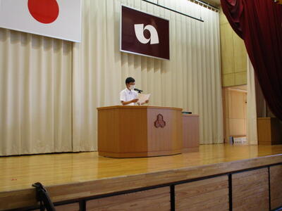 最後に、生徒会代表から、夏休みの学習と生活のポイントを発表し、全校生で確かめ合いました。