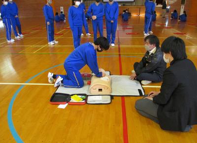 12月18日(金)、2年生と教職員を対象にAED講習会を行いました。講師の先生を福島ACLS協会からお招きしました。今回は感染症対策のため講師はお一人でしたが、わかりやすい講義と演習でした。初めて講習を受けた生徒がほとんどでしたが、大変上手でした。もう少し大きな声が出せればさらに良いと思います。