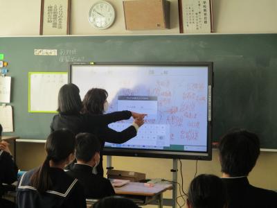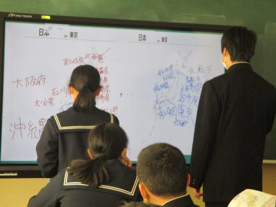 2月3日(水)、デジタル黒板を有効に活用していくための校内研修授業を行いました。この日は、授業の中で、デジタル黒板を駆使して、都道府県名を正しくかけるかどうか、ゲーム形式で行いました。