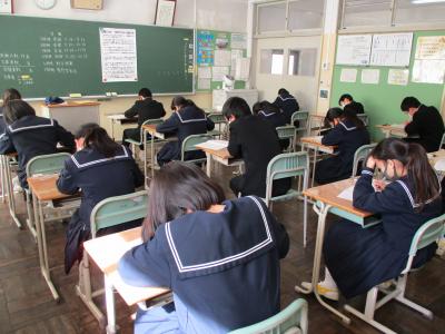 2月10日(火)、12日(木)には1・2年生の学年末テスト、3年生は最後の実力テストが行われました。1年間のまとめとして、どの生徒も真剣な表情でテストに臨んでいました。特に3年生はその多くの生徒が県立高校受験に向けて最後の力試しでもありました。