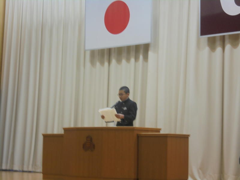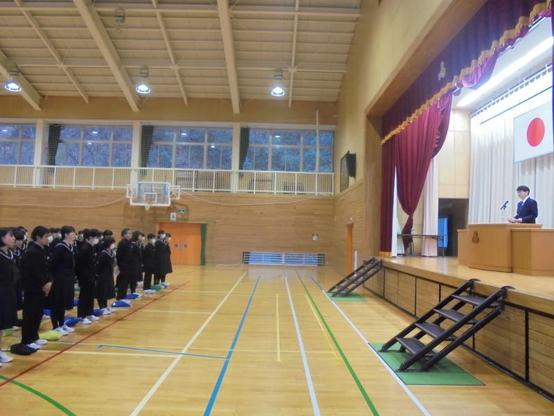 1月8日(水)、第3学期始業式を行いました。校長式辞の中で、1,2年生は50日、3年生は45日しかない3学期を、各学年それぞれの目標に向けて、1日1日を大切に過ごしてほしいと話しました。その後、各学年代表の3学期の抱負が発表されました。3年生はすでに私立受験が始まっています。風邪やインフルエンザに十分注意しながら、充実したまとめの3学期にしてほしいと思います。