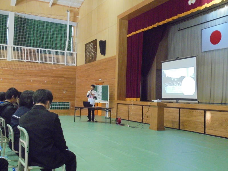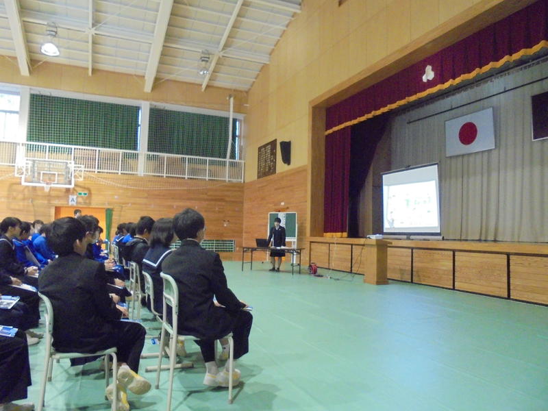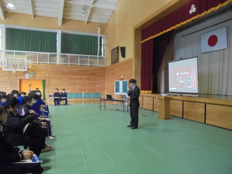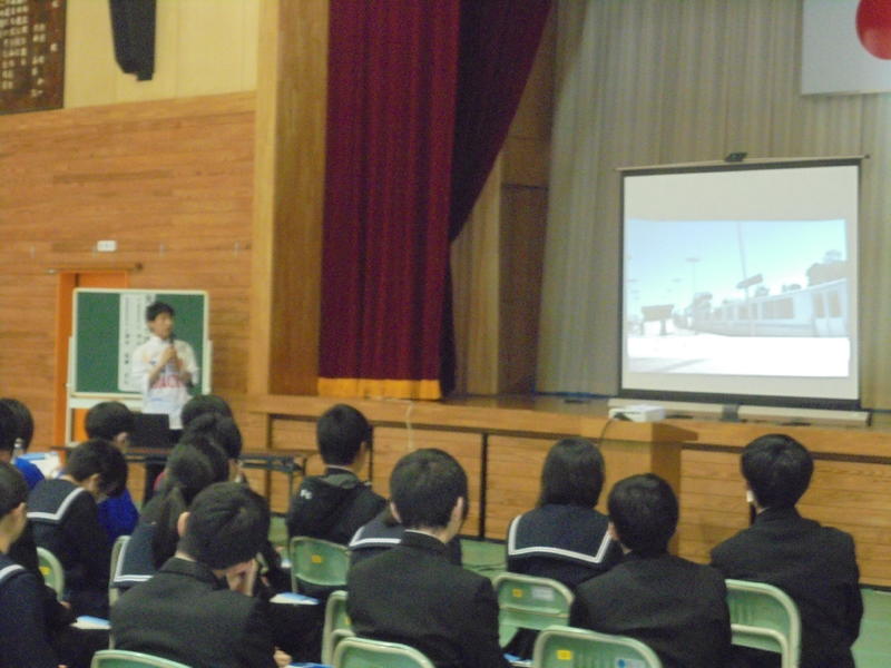 1月15日(水)、本校の卒業生で現在高校2年生の生徒2名を講師としてお迎えし、全校生で話を聞きました。最初は平工業高校の生徒会会長を務める生徒が、学校生活の様子をわかりやすく話してくれました。次に、磐城緑蔭高校の生徒が、企業のプログラムで夏休みにアメリカに行って学んだことを話してくれました。歳の近い先輩の話から、ぜひ何かをつかんで今後に生かしてほしいと思います。