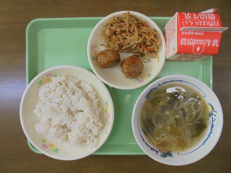 1月17日(金)の給食は、よくかむ献立です。よくかむことで交感神経が刺激され、内臓脂肪が燃焼すると言われています。麦ごはん、牛乳、れんこん入り肉団子、かみかみ和え、もやしと凍り豆腐のみそ汁です。肥満の予防・解消にも意識してよくかむことが大事です。