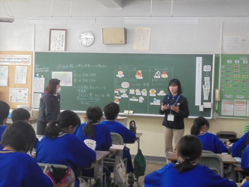 1月17日(金)、栄養教諭にお越しいただき、1年生を対象に食に関する指導を行いました。「成長期に必要な食事について考えよう」というめあてのもと、休みの日などにおにぎりだけ、菓子パンだけ、の食事ではなく、サラダやから揚げなど足すことが大切であることなどを学びました。