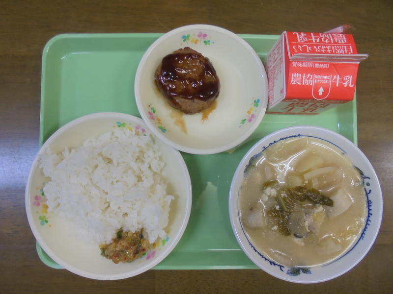 1月22日(水)の給食は、地域の郷土料理献立です。いわき市の北にある三和地区では、豆腐を多めの油で炒め、野菜をたっぷり使った「けんちん汁」が食べ継がれています。ごはん、牛乳、ハンバーグ・ソースかけ、ねぎの油みそ、三和に伝わるけんちん汁です。しっかり食べて、寒さを乗り切ってほしいと思います。