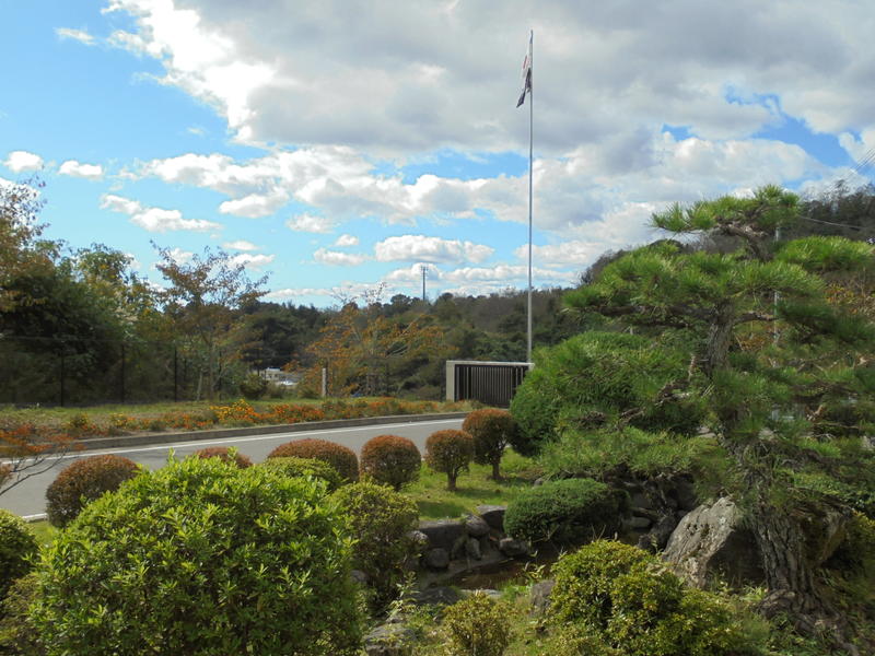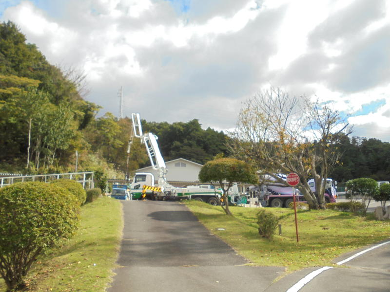 本校では9月半ばから始まった落石防除工事が続いています。今日(10月23日)は大型機械が入って、コンクリートを注入していました。校地内に車を乗り入れる際など十分にご注意ください。