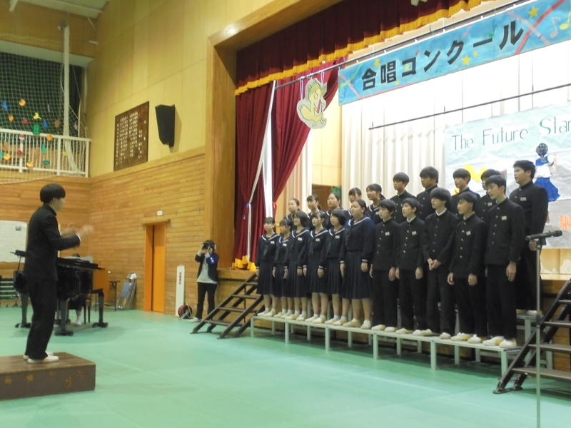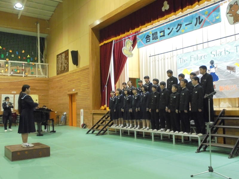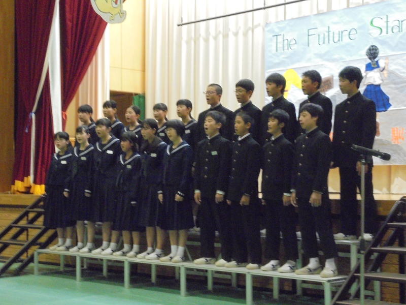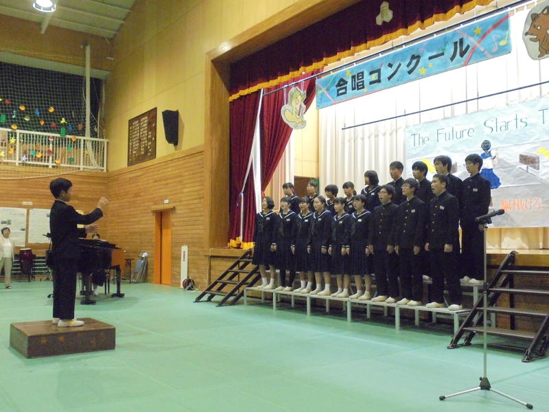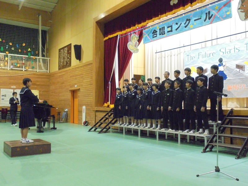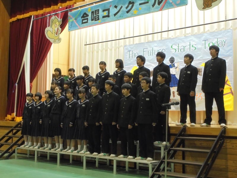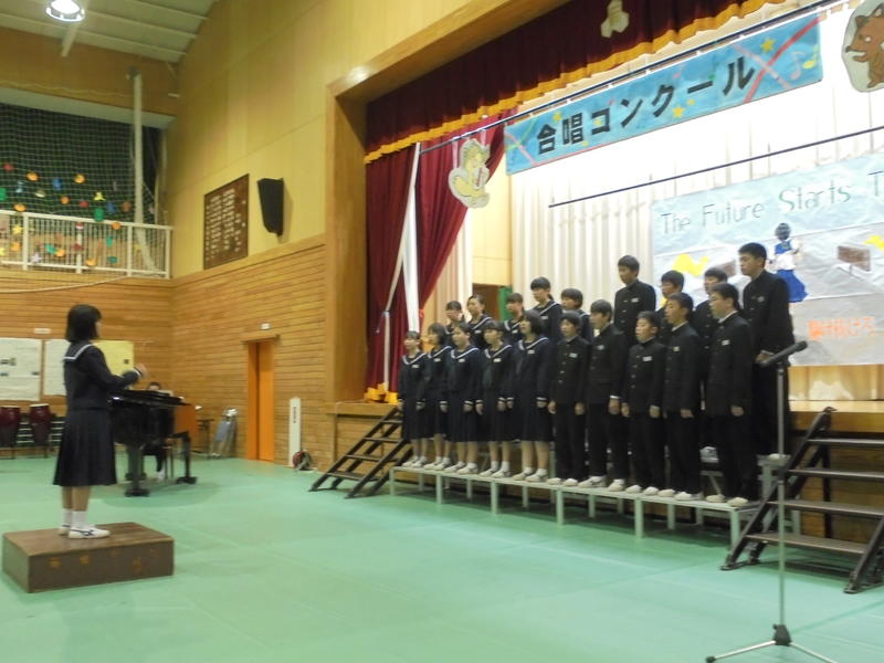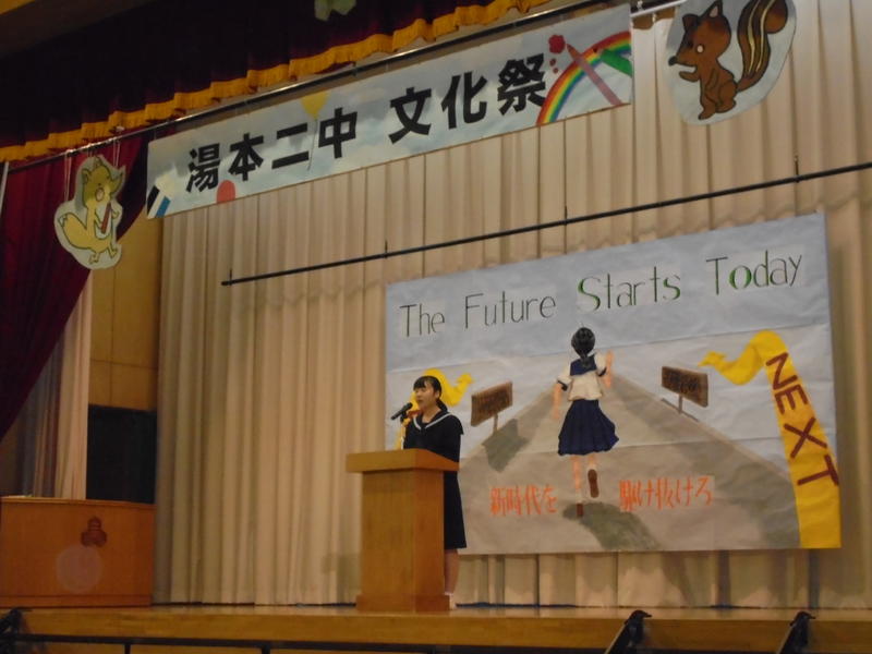 10月27日(日)、予定通り文化祭・合唱コンクールを開催しました。金曜日の大雨で土砂崩れがおこるなど心配しましたが、無事開催することができました。午前中に学年ごとの総合発表があり、しごと塾などで体験したことをプレゼンテーションで発表しました。午後からは合唱コンクールを行い、今までの練習の成果を披露しました。生徒一人一人が活躍し、思い出に残る一日となりました。PTAの皆さんには昼食販売等をしていただきました。ご協力ありがとうございました。