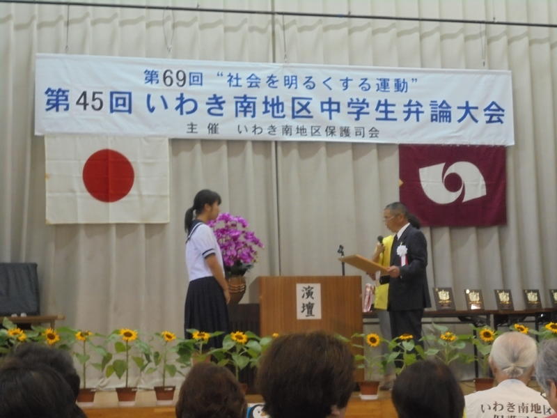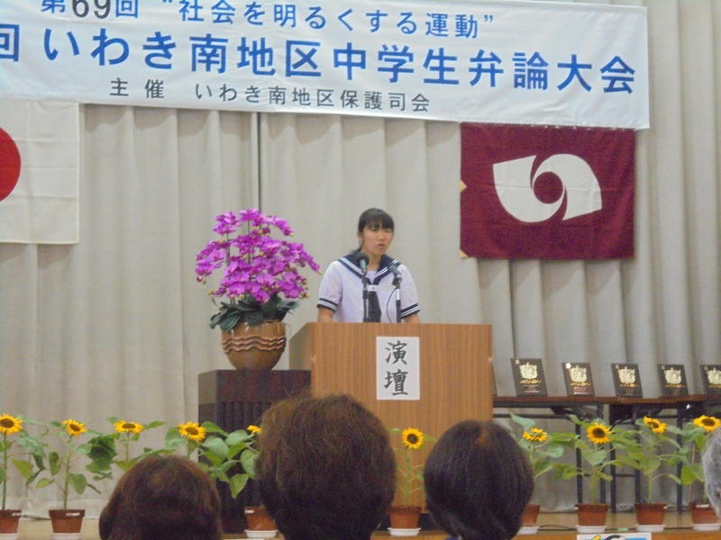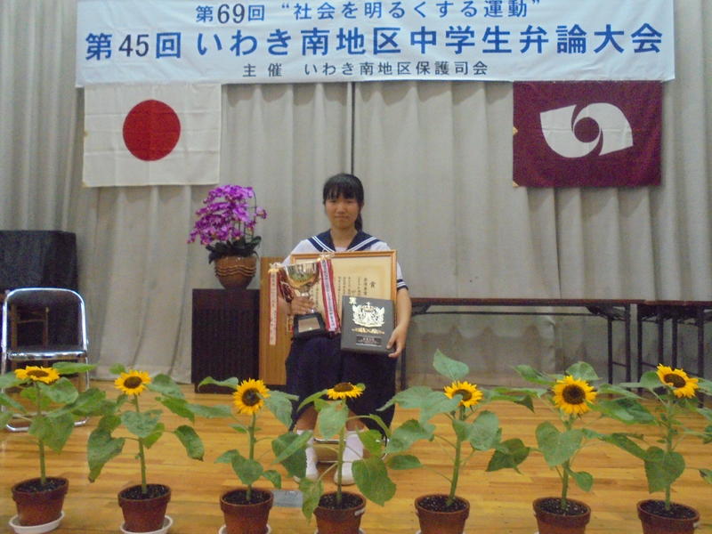 7月13日(土)、泉公民館でいわき南地区中学生弁論大会が行われ、本校からは3年の四ノ宮朱理さんが出場しました。南地区19校の代表生徒が、社会を明るくする運動の一環として、感情豊かに熱く意見発表をしました。四ノ宮さんは「常磐に生きる」という論題で、しごと塾で学んだ常磐炭鉱社長の言葉や日頃のあいさつ運動の経験を踏まえ、「一山一家」として支え合ってきた常磐地区の歴史のように、地域のコミュニケーションを大切にしていきたいと発表し、みごと最優秀賞を受賞しました。練習の成果が出た素晴らしい発表で、本当によくがんばりました。おめでとうございました。