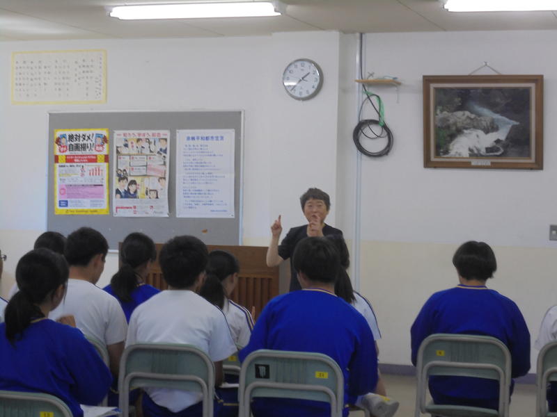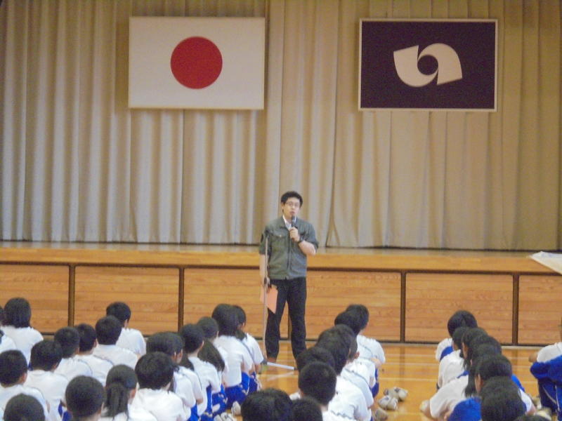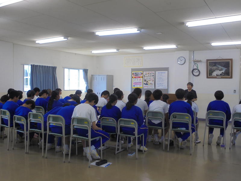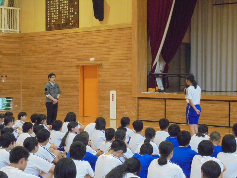 6月21日(金)、いわき中央警察署常磐分庁舎の巡査部長さんにお越しいただき、不審者対応の防犯教室を行いました。刃物を持った不審者が校舎に入り、教職員がさすまた等で対応して身柄を確保し、生徒を避難させるという訓練を行いました。その後、体育館で巡査部長さんからのお話を聞きました。非常時の対応や登下校時の安全について改めて確認しました。