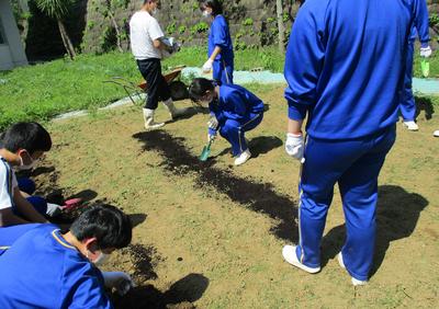 3年生は、技術の時間に、植物の苗を植えました。ミニトマト、キュウリ、スイカ、カボチャなど多彩です。今から収穫が楽しみです。それには手入れが大切ですね。