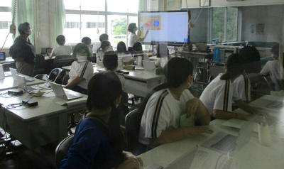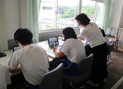 学校だよりでもご紹介したとおり、昨年度、本校の生徒用パソコンが最新式に更新されました。その活用を図るため、ICTサポーターの先生から様々な指導を受けています。