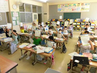 2023年8月25日 11時28分各教室では、久しぶりの友達との再会。夏休みの課題を提出し、夏休みの思い出を話したり、2学期のめあてを書いたりしていました。