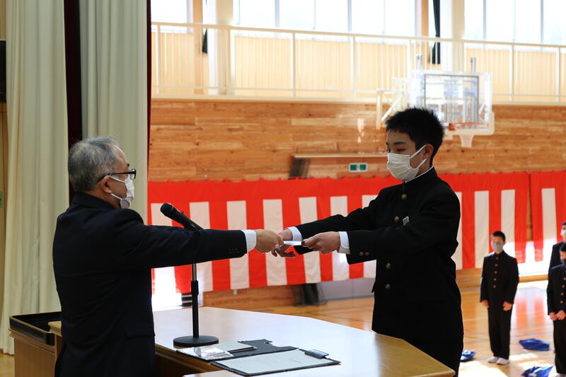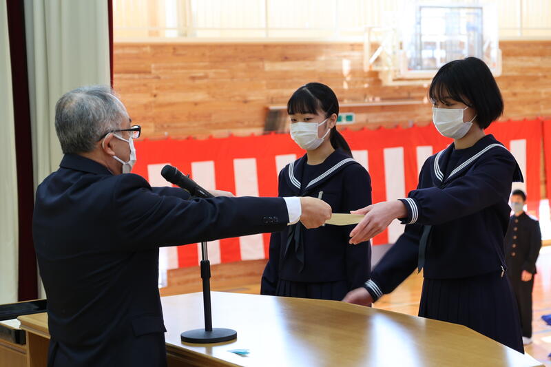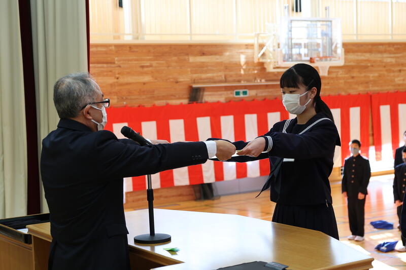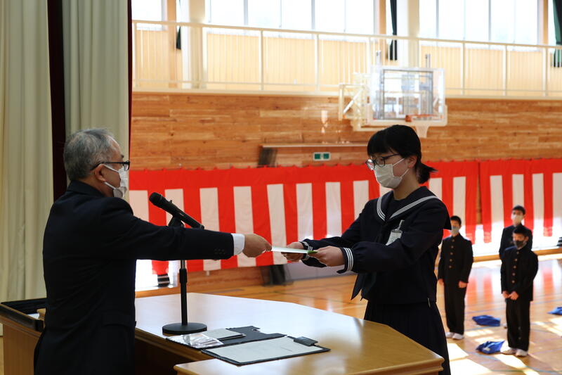 修了式では、学年の代表生徒が修了証書を校長先生から受け取りました。