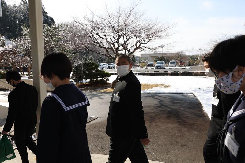 体育館入場。昨日の雪が残る中庭を見ながら、生徒達は明るく元気な姿を見せてくれました。