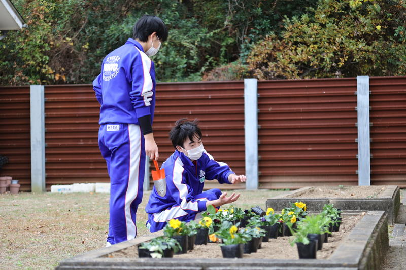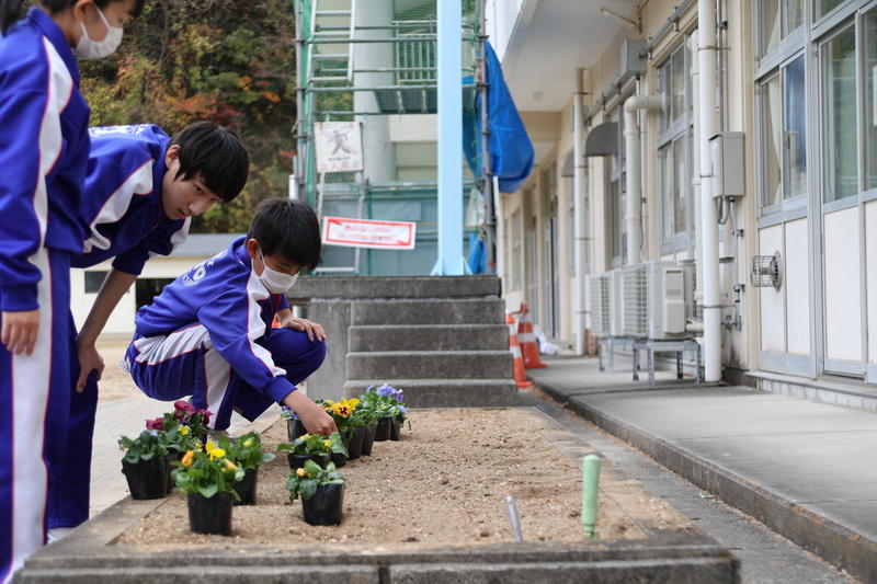 2020年11月20日 16時30分生徒会のJRC委員会で、本日花壇に花を植えました。湯本三中には花壇がたくさんあります。普段は用務員さんが花を育ててくれていますが、今日はJRC委員会の生徒達が、校庭側の花壇にパンジーなどを植えました。